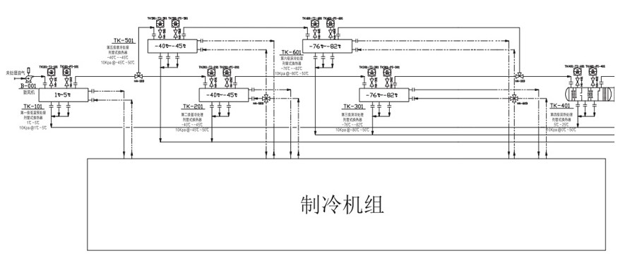 將揮發(fā)VOCs氣體導(dǎo)入到設(shè)備冷箱(裝置zui多設(shè)置冷凝溫度3℃-40C-75C-115C)可以定制其他溫度區(qū),根據(jù)需求進(jìn)行逐級冷凝液化。部分連續(xù)生產(chǎn)工藝在低溫段做了雙路切換工藝(一側(cè)冰堵后,直接切換到另一路換熱冷箱冷凝,同時冰堵側(cè)做融霜處理。)